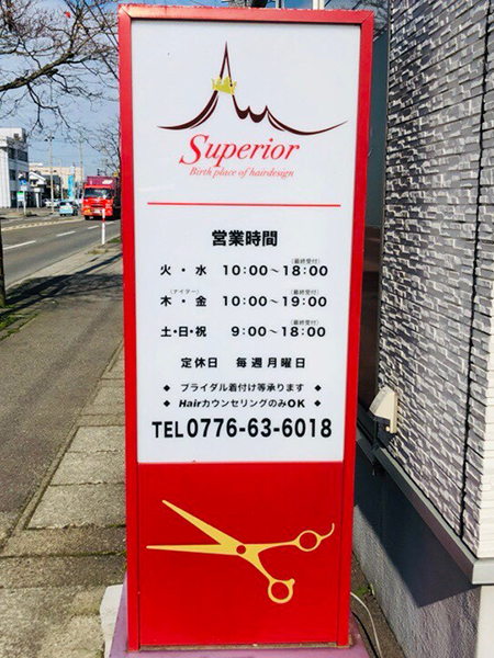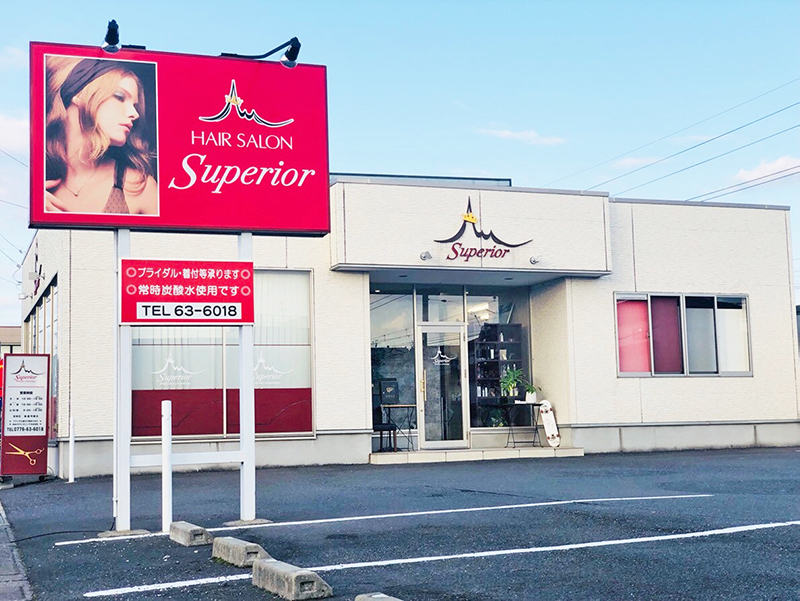 福井のフェニックス通り沿いにあるSuperior。外壁のSuperiorのロゴマークと道路沿いの赤い看板が目印です。